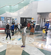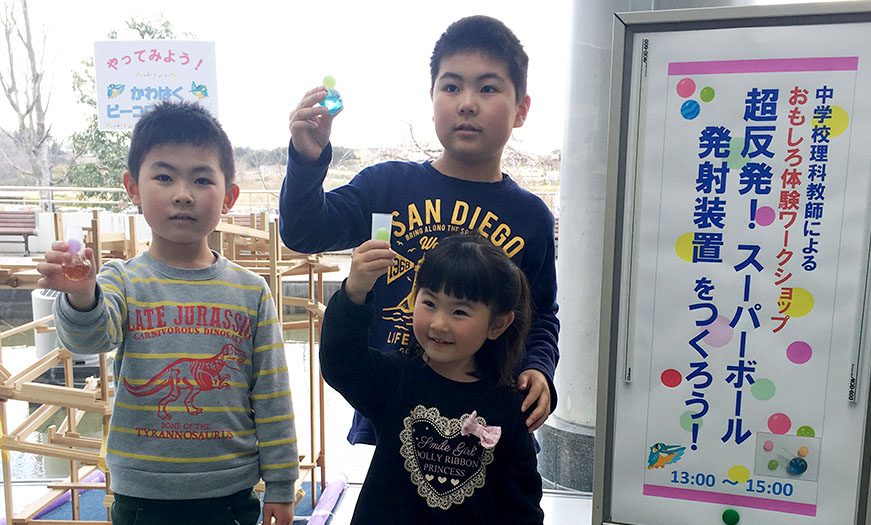 思った以上の反発力に驚く子どもたちや、なかなか弾まない発射装置を手に、先生から落下させるコツを教えてもらい楽しむ子たちでリバーホールは賑わいました。