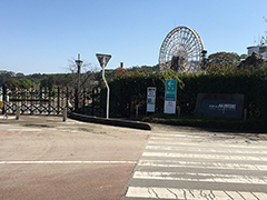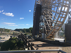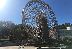 (試運転で飛沫をあげる大水車と入場口周辺)