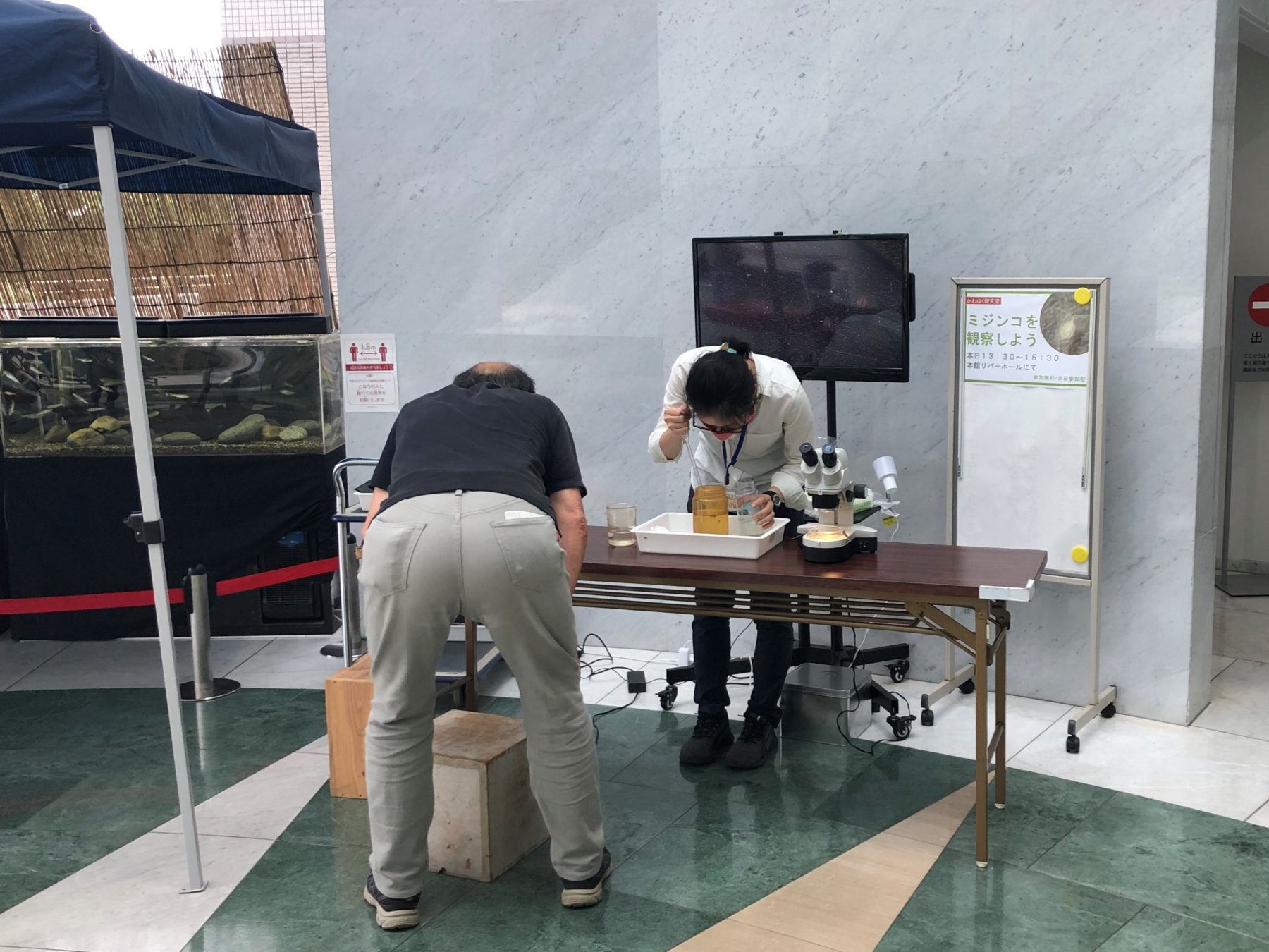 水田で採ってきたミジンコを、実体顕微鏡2台にセットし、来館者の方に覗いてもらいました。