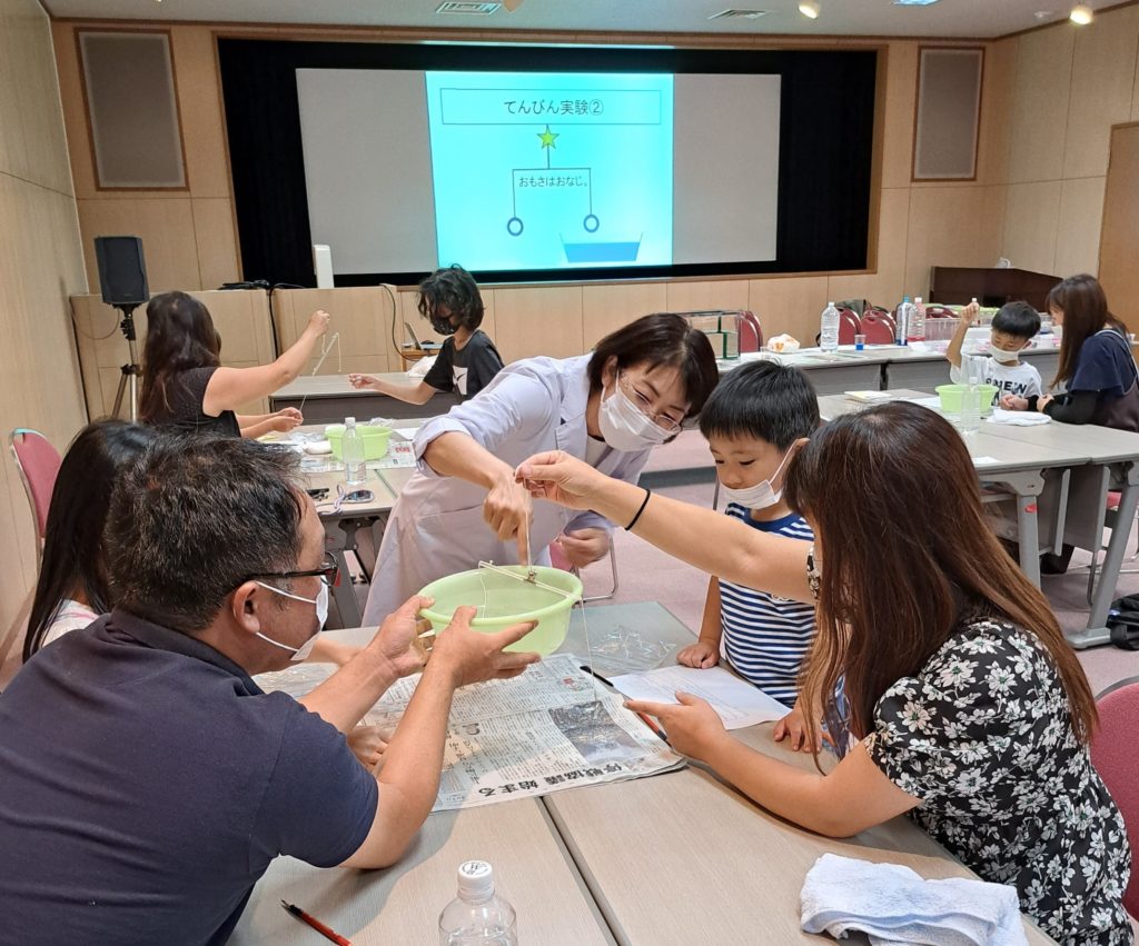 同じ重りを着けた天秤を片方だけ水に入れるとどうなるのかの天秤を使った実験や、いろいろな野菜を水に入れて浮く野菜、沈む野菜はどれでしょう?といった実験なども行いました。楽しい科学かいとなりました。
