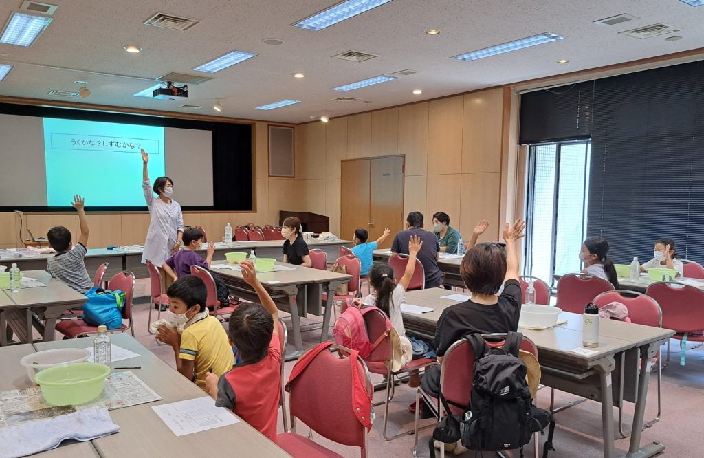 物が浮いたり、すぃ~っとボートが水の上を進んだりといった水の不思議について、科学インストラクターの滝沢さんと一緒に学びました。