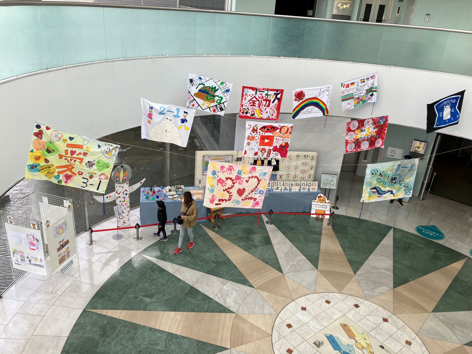 体育祭で使用した“応援旗”や、授業で制作している布製品などを展示しました。