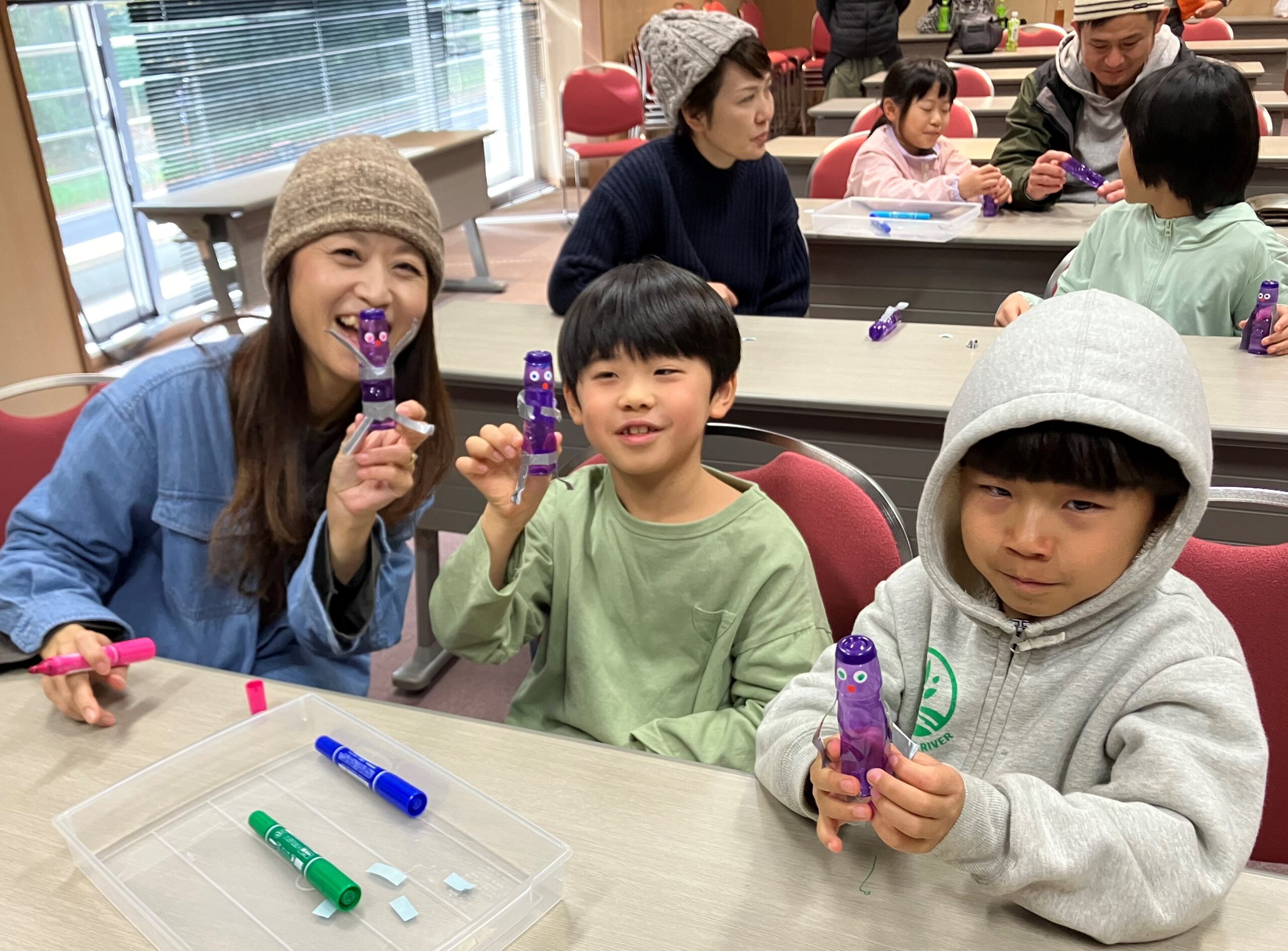 初めに、ふれあいホールで川に潜む“アブナイかっぱ”のお話を聞いた後、お菓子の空き容器で自分の人形を作り、準備ができたら荒川わくわくランドに移動です。