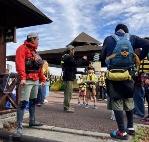 流れる人形を観察しながら、川のどんな場所にかっぱが潜みやすいのかや、いたずらしやすいのかを教えてもらいました。パックラフト(小型の膨張式ボート)体験も行いました。