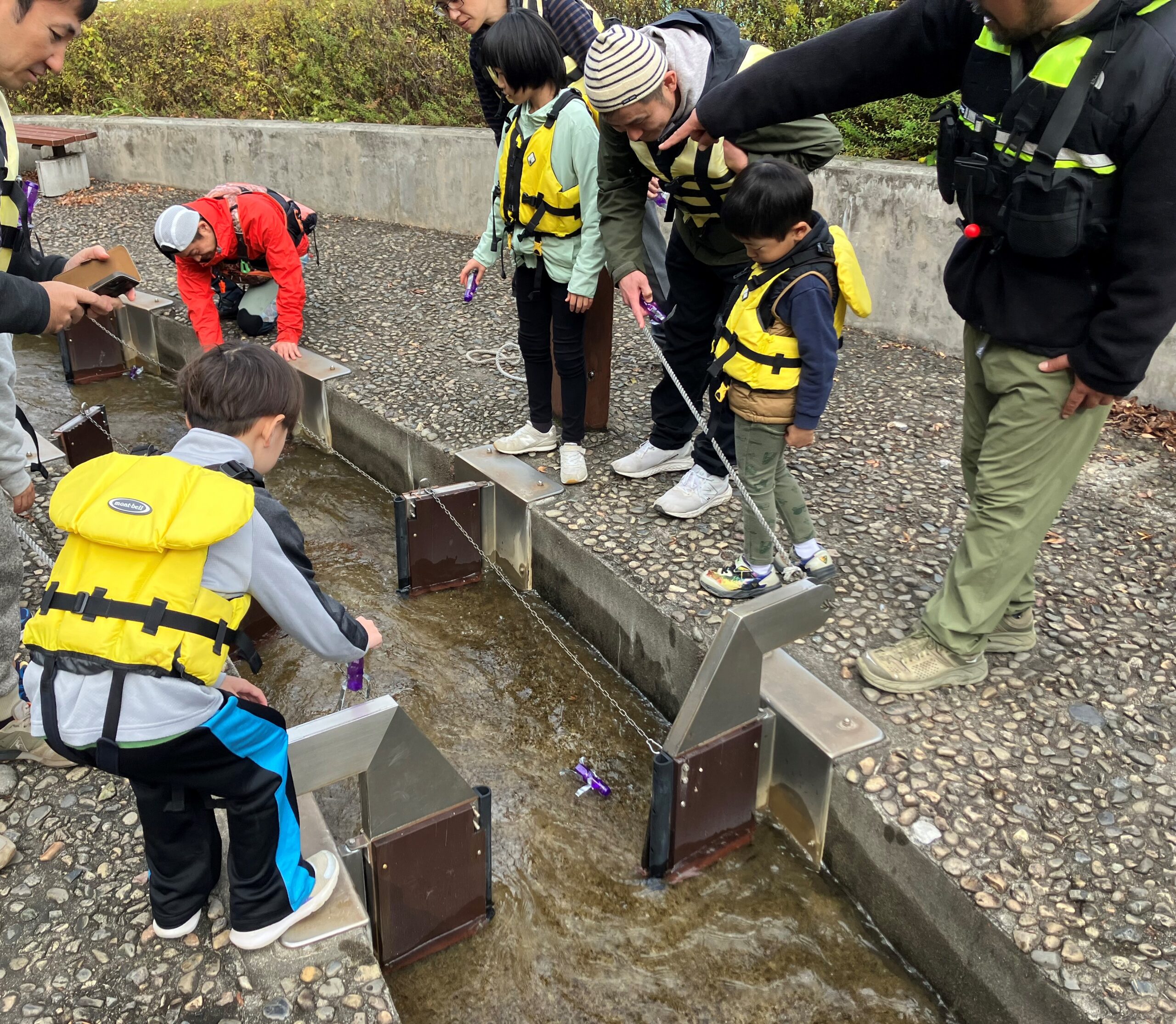 どこの流れに“かっぱ”が潜んでいるか、自分の人形を水に流して観察します。