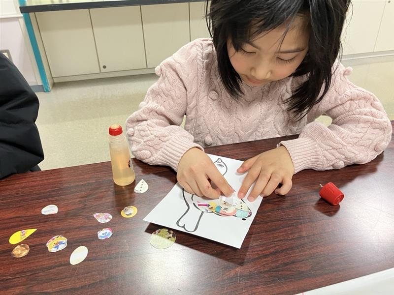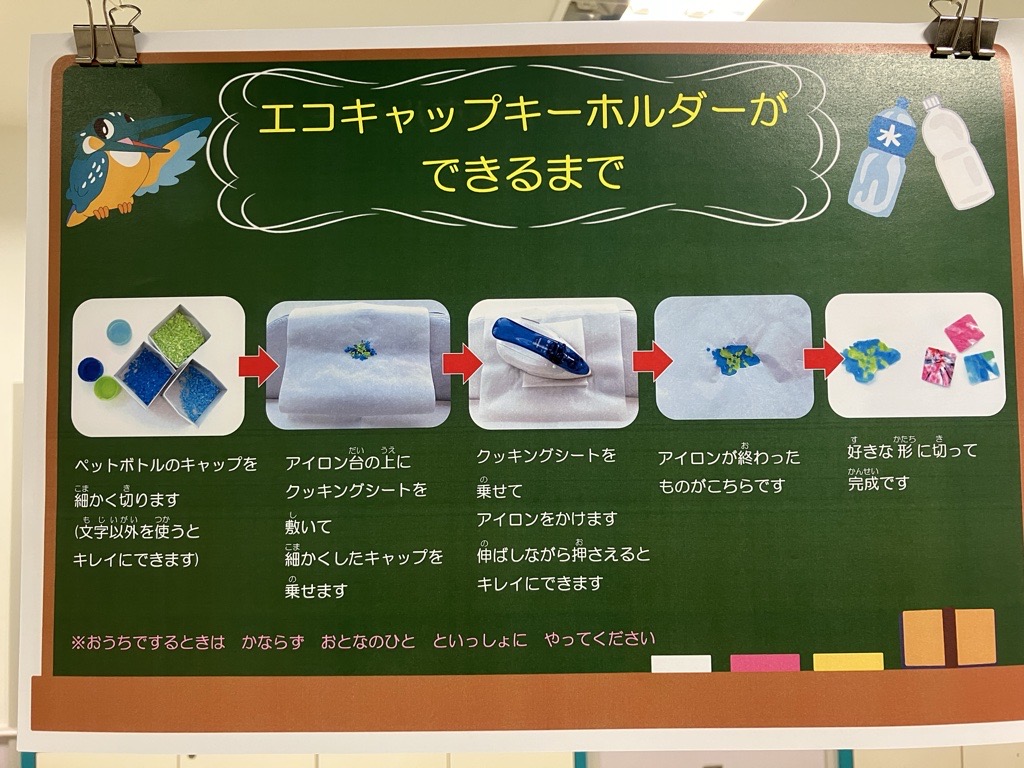 ペットボトルキャップを使ったキーホルダー作りと、チラシを使ったアート作品作りが体験できるワークショップ
